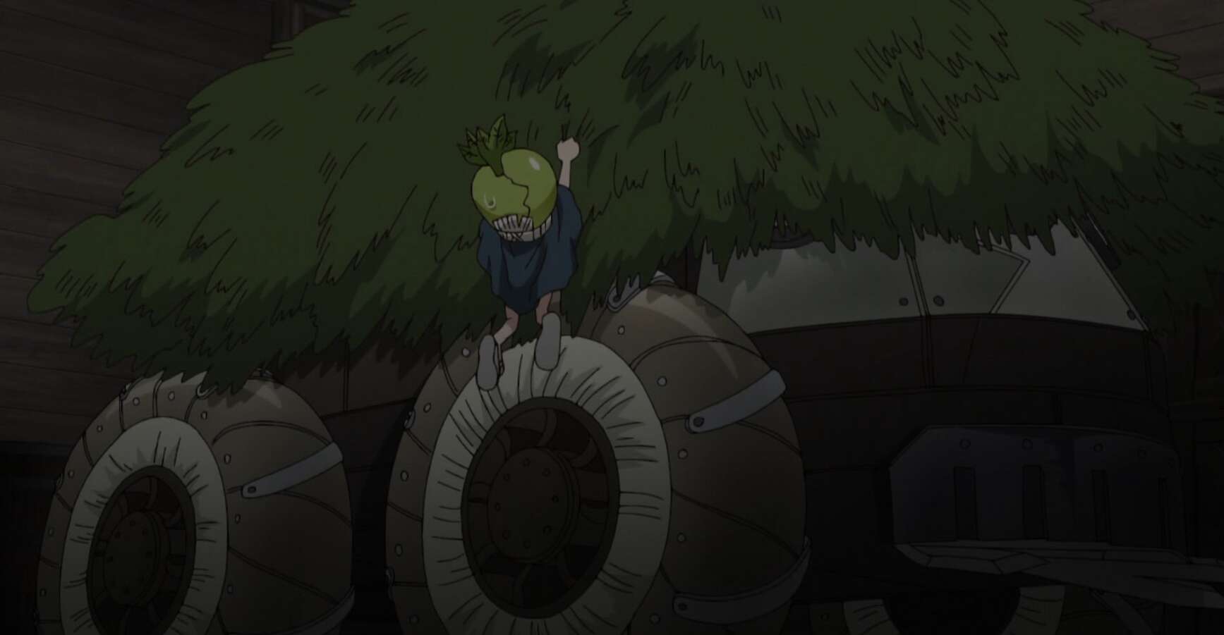 脱出させたラボカーに千空達は乗り込み、スイカと銀狼は千空達と合流します。しかし、脱出したラボカーはすぐに敵に取り囲まれてしまいます。しかしながら、島の人は自動車を知らないので、ラボカーを生き物と思い込み取り囲んだままラボカーに近付こうとしません。