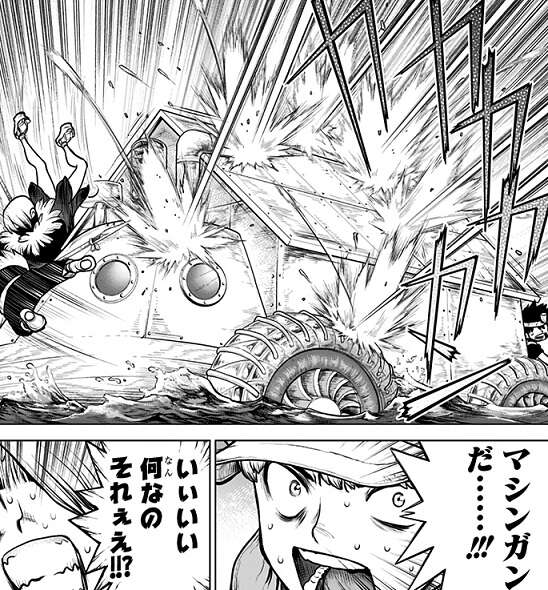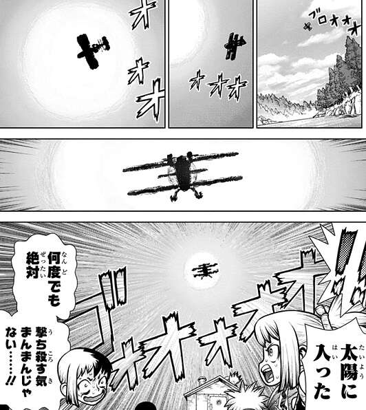 アメリカ大陸にも千空と同じく自力復活した科学使いがいて、それがマシンガンで攻撃したと千空達は予想しますが、そんな会話をしている時千空達が乗っている船にエンジン音が後ろから近づいてきます。近づいてくるエンジン音の正体は飛行機で、低空飛行しながらマシンガンを乱射し再び千空達を攻撃してきます。