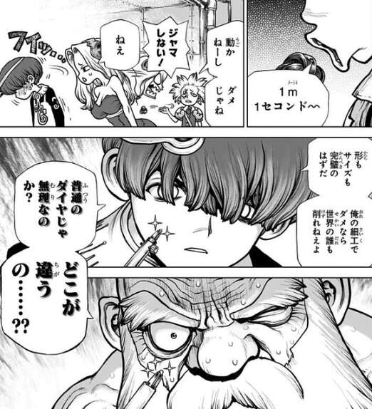 完全装備の米軍特殊装備のスタンリー達にまともにやり合っても勝ち目は限りなくゼロの為、石化装置で自爆し後から味方だけ復活する戦法を使うことにします。しかし、カセキやジョエルがいくつダイヤ電池を試作しても石化装置は動かず、ダイヤ電池作りに苦戦します。