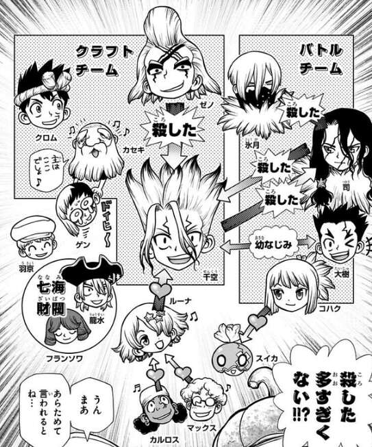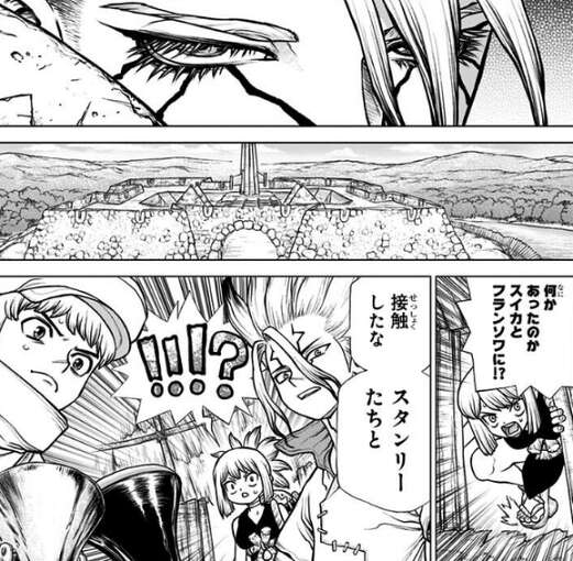 毒蜘蛛に噛まれた敵を助けたスイカは、スタンリーに見つかってしまいフランソワと共に捕まってしまいます。しかし、フランソワは捕まる直前に電波を使ってコーンシティにモールス信号を送っており、その電波をキャッチした千空達はスタンリーの居場所を把握します。