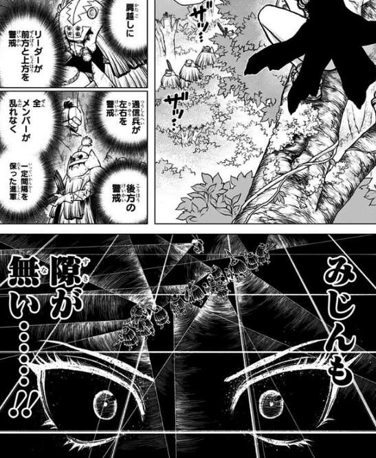 スイカが捕まったと分かりコハクは速攻、飛び出しますが戦闘のプロである米軍特殊部隊のスタンリー達は、一部の隙も無く警戒しながら進軍していてコハクは手を出せません。その後、司・氷月と合流したコハクは敵の通信機を破壊しようとしますが、スタンリー達に見つかってしまい死を覚悟で敵に挑みます。