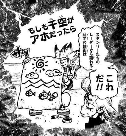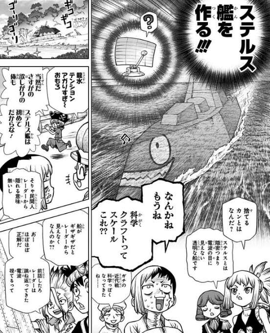 一方、千空達を追跡するスタンリーからも逃げ続ける必要があり、スタンリーのレーダーに捕捉されないようにする為、新調する船はステルス艦にしようとします。しかしステルス技術は軍事機密でもあり、簡単に作ることも出来ず苦労します。