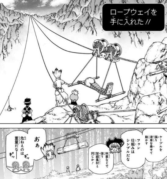 コハクに山を飛び越えてもらい、ワイヤーを掛けてロープウェイを作ります。重量の関係から人間は一度に二人までしか運べず、体重が重すぎるとロープウェイが切れてしまうので、ペアとなる人物を考えるのに苦労します。