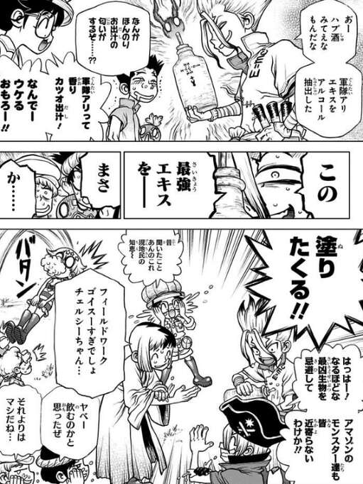 千空達はアマゾン大密林に到達し、あとは石化装置があると思われる爆心地・マナウスまでひたすら川を下ります。アマゾンの最強生物・軍隊アリを、軍隊アリから抽出したエキスを全身に塗りたくって防護して、苦労しながら何とか石化装置がある場所までたどり着きます。