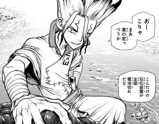 爆心地・マナウスで見たものは、ピラミッドのように高く積み上げられた無数の石化装置の山でした。千空達が早速石化装置を起動しようとしますが、どの石化装置も起動しません。山のようにある石化装置が全て電池切れだと分かり、今度は無数にある石化装置を利用して分解・解析を試みます。