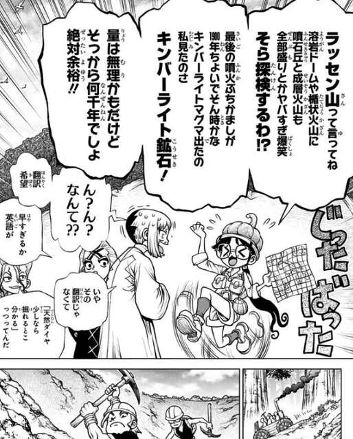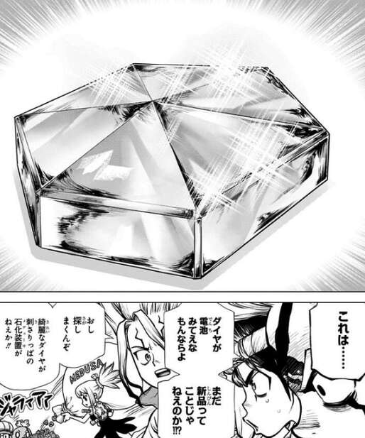 コーンシティにいるメンバーの協力もあり、ゼロからダイヤモンドを作ることに成功します。しかし石化装置の電池サイズには届かず、天然ダイヤを採取しそのダイヤを作成した人工ダイヤで研磨してダイヤ電池を新造する計画を立てます。早速、コーンシティにいるメンバーがラッセン山に天然ダイヤを採取に向かいます。