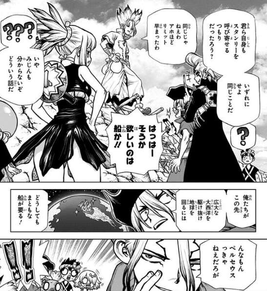 ブラジルの都市・アラシャで天然ダイヤを採取し、アラシャに超合金の街を作ることにした天空達は、アラシャへと向かいます。しかし、Dr.ゼノが無線でスタンリーに信号を送った為、スタンリー達もアラシャへと先回りしようとします。千空達はペルセウスを取り戻す必要もあり、アラシャにてスタンリーとの最終決戦を決意します。