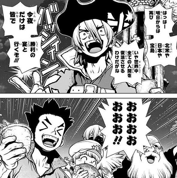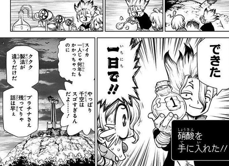 約7年ぶりに復活した千空は、スイカが何度も何度も失敗しながらも硝石畑から復活液を作り出したことを聞き、やるじゃねえか、スイカ…!!と、スイカを褒めます。その後、千空は硝酸を作成しますが、1日で硝酸を作り出し作り出すのに何年もかかったスイカを驚かせます。