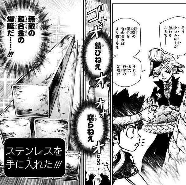 仲間となったDr.ゼノは宇宙船のロケットエンジンを作成するために、様々なレアメタルを採掘していきます。さらに沈没していたペルセウス号を解体し、鉄をリサイクルすると金属と金属を組み合わせ無敵の超合金・ステンレスを作成します。