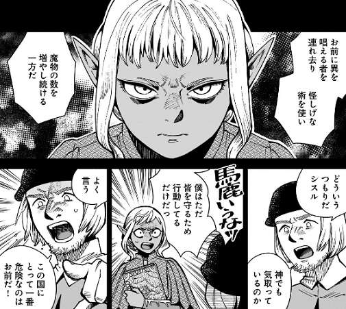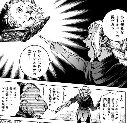 シスルは次の目当てを、無礼なトールマンの男、ハーフエルフの女、長らくここに住み着いているドワーフ、と言い当てます。ライオス、マルシル、センシの事ですが、今度は複数の主を据えるのか、とシスルは翼獅子に言います。翼獅子は、ライオス達がシスルを救ってくれるから、と言って否定しますが、シスルは全部嘘だと言って翼獅子を攻撃します。