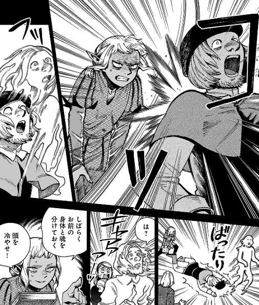 エオディオは地下迷宮を勝手に出て行こうとしますが、シスルはエオディオの背後から本でいきなり殴ります。するとエオディオの身体と魂が分離してしまいます。シスルはエオディオに頭を冷やすように言い、デルガルはシスルのやったことに頭を抱えショックを受けます。
