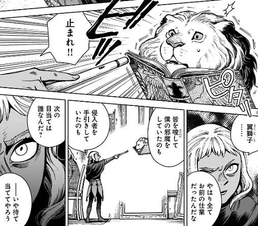 シスルは翼獅子の言葉を信じず、無理やり本を閉じて翼獅子を本の中に再び閉じ込めます。翼獅子の封印に成功したシスルは、一人高笑いします。