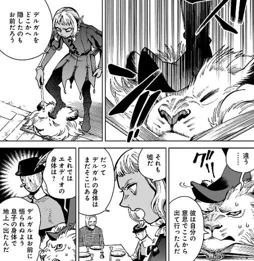 デルガルやヤアドと一緒にテーブルに囲んで座っていたかかしは、デルガルの息子のエオディオだった事が分かり、デルガルはシスルに悟られないようにエオディオの身体で地上に上がっていたようです。だから、デルガルの肉体はまだ地下迷宮に残ったままでした。