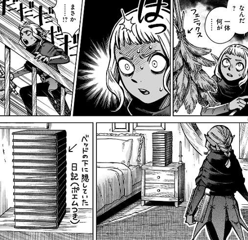 ファリンが外で待っている間、シスルは自分の家の中に入り翼獅子の半身を捜そうとしますが、自分の家の中の様子が違う事に気付きます。本棚は勝手に整理されていて、食器も勝手に片付けられていて、フェニックスの羽根で作られた掃除道具まであります。さらにベッドの下に隠していたポエムつきの日記を勝手に出されているのを見て、完全にシスルはキレて激怒します。