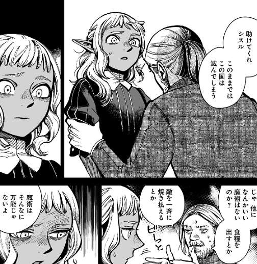 デルガルは地下迷宮に引き籠もってずいぶん経ったと、そろそろ地上に戻ろうとシスルに言いますが、シスルは外では皆を守れないと反対します。その時、エオディオが怒ってシスルに掴みかかります。シスルのやっている事は支配で、シスルに異を唱える者を連れ去り、怪しげな術を使い、魔物の数を増やし続けると、エオディオは言い、この国にとって一番危険なのはシスルだと言い放ちます。