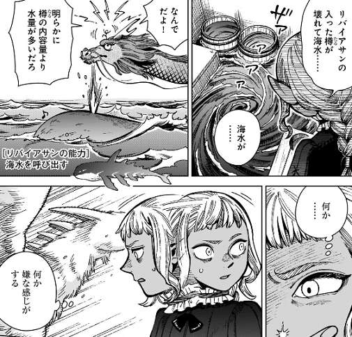 樽の中にはリバイアサンが入っていたようで、リバイアサンが呼び出した大量の海水が部屋を埋め尽くします。ワームとレッドドラゴンは海水に溺れてしまいますが、ホワイトドラゴンは飛んで海水を回避します。何か嫌な感じがする、とシスルは何かを感じとり、ワイバーンにライオスの死体を探すように命令します。
