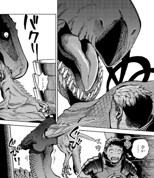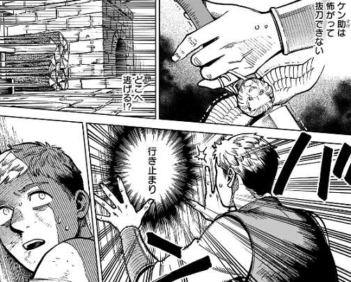 竜三匹に追いかけられていますが、竜は協力し合ったりはしないので、1対3の状態ではない、とライオスは何とか逃げ切ろうとします。しかし、ケン助は怖がっていて抜刀することも出来ず、行き止まりに追い込まれてしまいます。