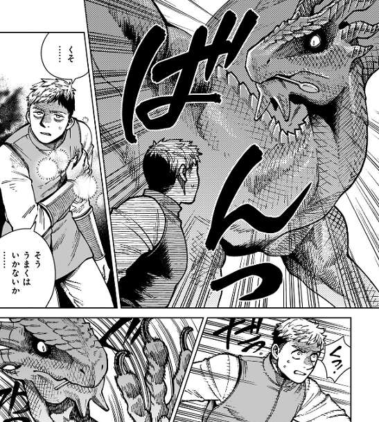 スプーンをくわえたままグリーンドラゴンはライオスを再び、襲います。グリーンドラゴンと正面から戦う形になってしまい、ライオスは手も足も出ずいいようにやられてしまいます。しかし、グリーンドラゴンはライオス相手に遊んでいるのか、すぐには殺さずただ手や口先で投げ飛ばすだけです。
