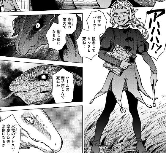 シスルにも見つかってしまい、レッドドラゴンの業火で消し炭になるか、ワームの毒で苦しんで死ぬか、ホワイトドラゴンのブレスで窒息した後氷像になるか、どの竜に殺されたい?とライオスは好き勝手に言われます。しかし、ライオスは少し考えた後何か思いついたのか、…本当に?と、シスルに問いかけます。その仕草が癇に障ったのかシスルは三匹全員に攻撃を命じます。