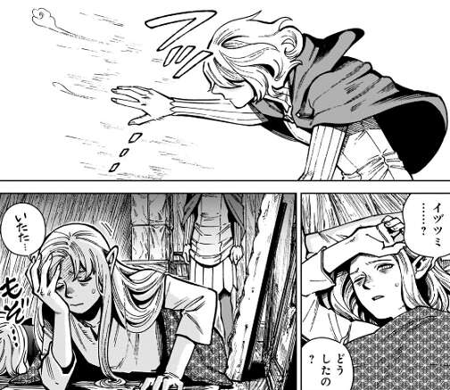 一方、マルシルはお酒を飲み過ぎたのか、二日酔いになっていて起き上がることが出来ません。とりあえずマルシルは水を飲ませて、寝かせます。チルチャックは、後はもう帰るだけと、ゆっくり行こうと言い、この旅が終わったらどうするか聞きます。センシは、今まで通りの生活を続けるつもりで、チルチャックは東方大陸のカーカブルードに戻って、店をやるつもりだと話します。