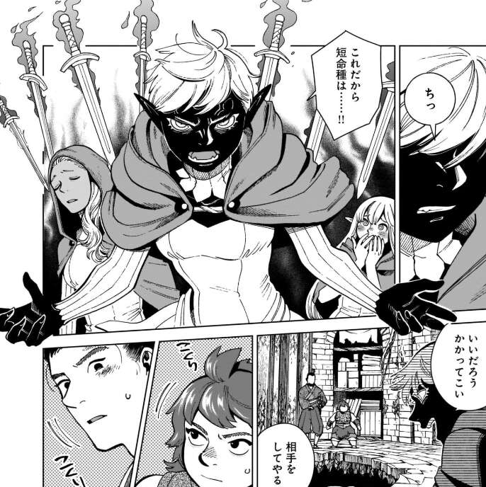 ナマリやシュローも、ライオスは良いやつだよ!と言いますが、シュローは、そもそもあいつらがエルフに何かできるとは思えないんだが、と言い、ライオス達に仲間を攻撃された、というカナリア隊の話が真実なのか怪しい以上、迷宮に関する話も受け入れ難いと主張し、エルフには従えないとナマリ達やオーク達は武器を構えます。