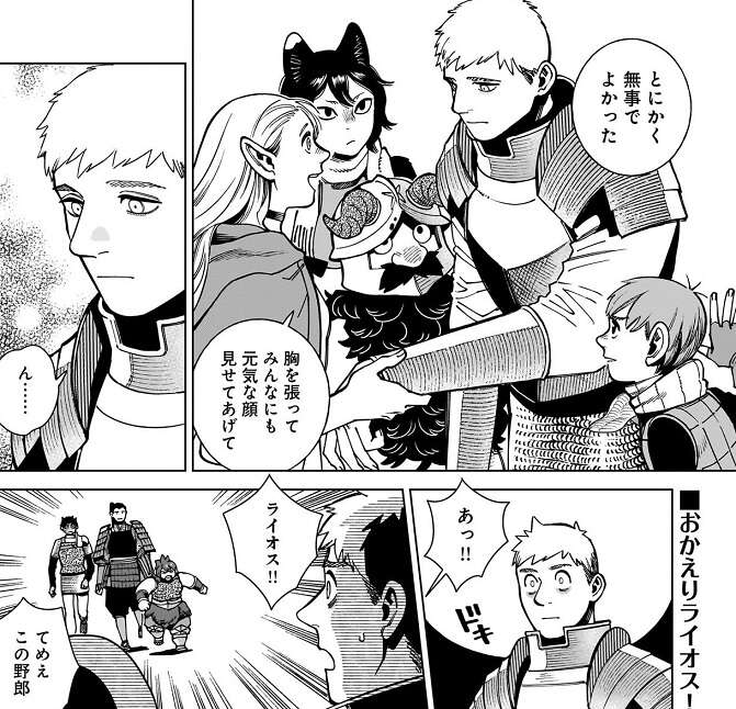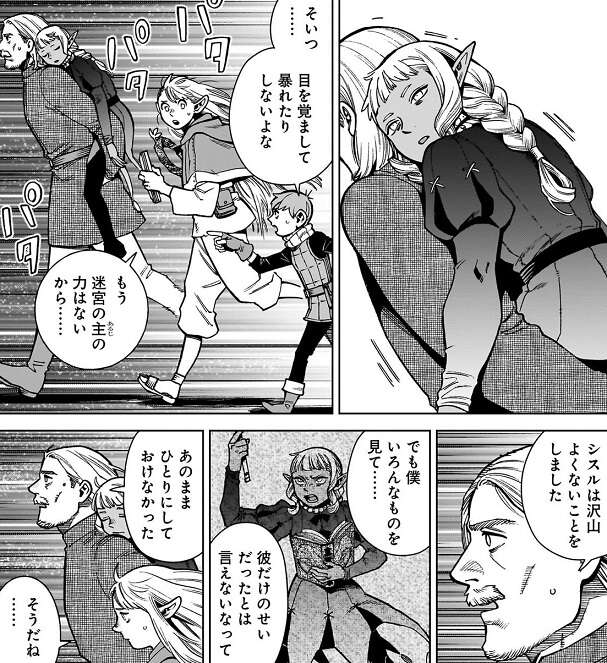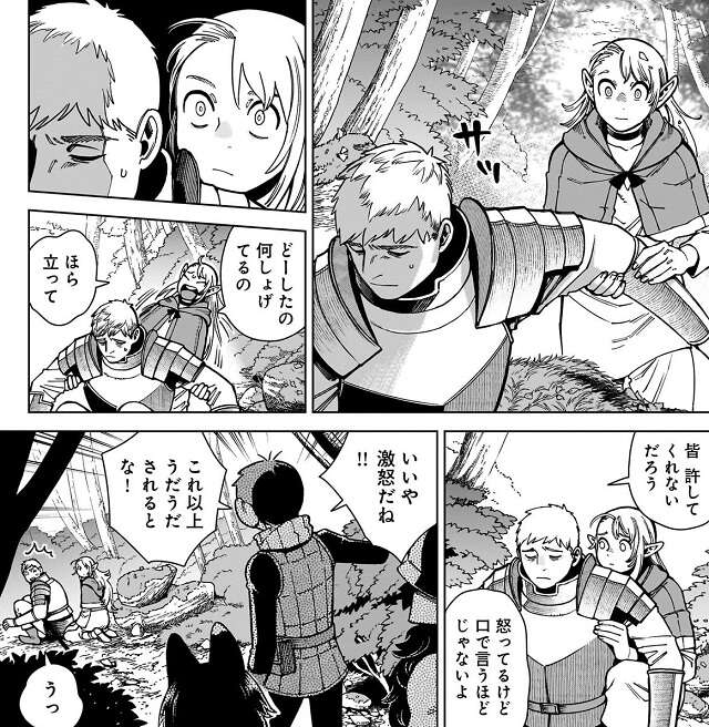 ライオスは皆が許しくれないだろう、としょげていて、マルシルは強引にライオスを立たせようとします。すると、チルチャック、センシ、イヅツミもその場所に現れ、ライオスに詰め寄ります。しかし、皆そこまで怒っておらず、ライオスが人型に完全に戻っているかチェックします。