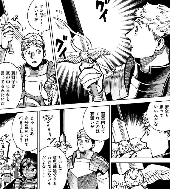 狂乱の魔術師の家にたどりついたライオス達ですが、マルシルとチルチャックは、何があるか分からない、魔術師と鉢合わせは御免被る、と様子見した方がいいと言います。翼獅子は、家の中に入れと言ってきますが、安全かどうかははっきりせず、翼獅子とは上手く意思疎通が出来ません。