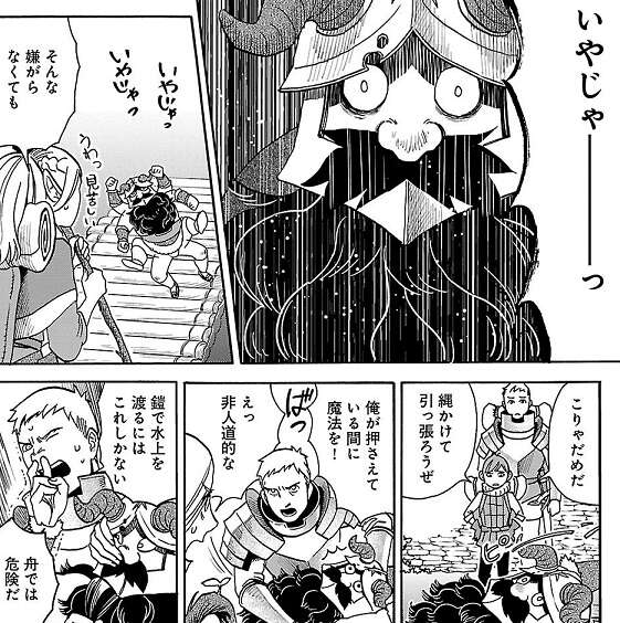 そして、第4階層の地底湖に到達したライオス達は、水上を進む必要がありマルシルの水上歩行の魔法を使おうとしますが、センシは水上歩行の魔法を断固拒否します。