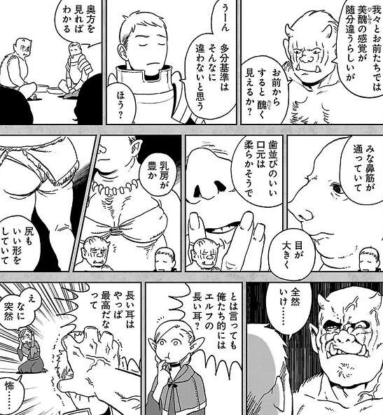 オークのよもや話では、トールマン(人間)やオークの美醜の感覚の違いの話題になります。オークから美醜の感覚が随分違うから、ライオスから見たらオークである自分達は醜く見えるのかと聞かれます。ライオスは多分基準はそんなに違わないと思うと言い、オークの奥さんの綺麗な所や、体の素晴らしい所を語りますが、他種族にも興味津々なライオスの性格が災いしオークを激怒させてしまいます。