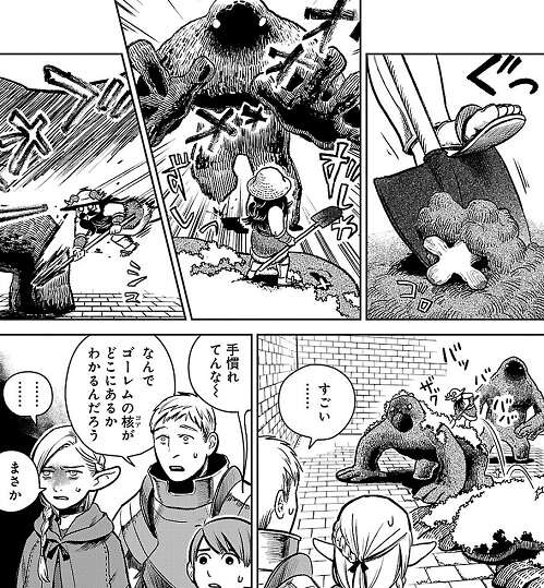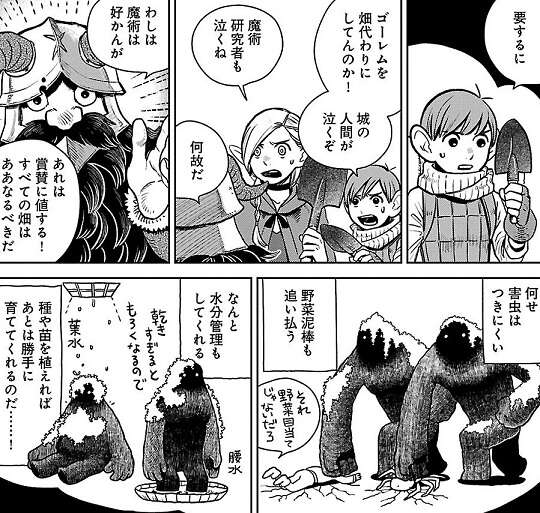 第3階層の黄金城の中では、スケルトンやグール、そしてゴーレムなどが住み着いています。センシはそのゴーレムを畑代わりにしていて、ゴーレムで野菜を育てています。マルシルやチルチャックは抗議しますが、ゴーレムを畑として使えば、害虫はつきにくい、野菜泥棒も追い払う、水分管理もしてくれる、種や苗を植えればあとは勝手に育つ、とゴーレムを絶賛します。