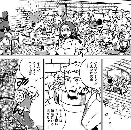 ゴーレムから野菜を大量に収穫したライオス達ですが、4人で消費できる量ではなく無駄に荷物になっています。仕方がなく物々交換で野菜を交換しようとしますが、物々交換を持ち掛けた先では、金目のもの以外は話にならずつまみ出されそうになります。そこに深層にいるはずのオークの襲撃があり、ライオス達も拘束されてしまいます。