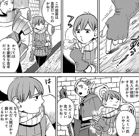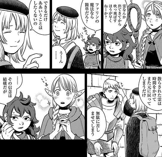 第3階層を進んでいると、霊の群れが近づいている事に気付きます。ライオスが落とした食べ物に気を取られていると、幽霊に取り憑かれそうになります。マルシルの魔法で何とか霊を撃退しますが、魔法の爆発音でさらに霊達を惹きつけてしまいます。霊の対処方法を話していると、ライオスの妹 ファリンは霊の扱いが上手かったという話になります。
