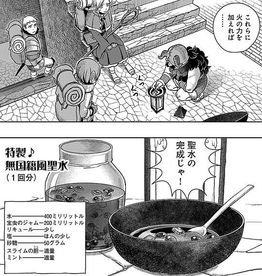 ファリンの話をしていると霊の群れに囲まれてしまい、センシは霊を追い払う魔除けを作り始めます。ろうそくの火や、宝虫の巣のジャム、酒、塩、スライムの肝など、ありあわせの材料で、無国籍風の聖水を完成させます。