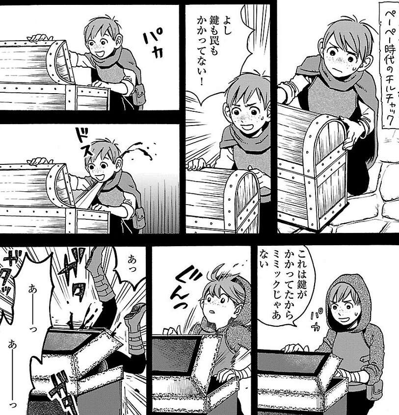 ライオスが絵画で遊んでいたため思う様に先に進めず、結局第3階層で睡眠をとり夜営する事になります。厨房跡に水汲み場を見つけて休むのにちょうどいい部屋をライオス達は見つけまずが、その近くでチルチャックは魔物の擬態(ミミック)まで見つけてしまいます。ペーペー時代にミミックに辛酸をなめさせられているチルチャックは、ミミックの存在を他の皆には言わず、1人で警戒します。