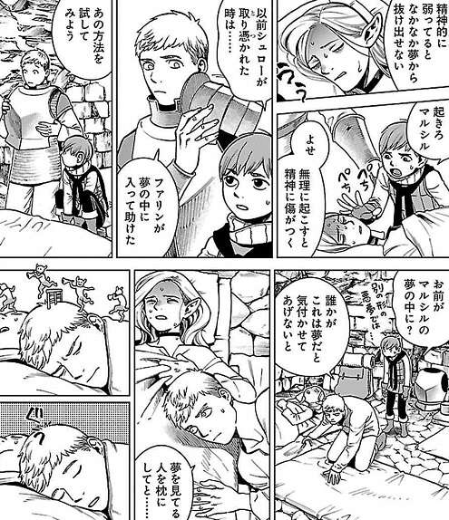 最近のマルシルは随分疲れているようで、ライオスは見張りを自分に任せて休むようにマルシルに言います。マルシルは文句を言いながらもすぐに眠ってしまいますが、その内寝息はひどくうなされる声に変わり、ライオスやチルチャックから見るとかなり苦しんでいるようにみえます。マルシルは魔物の夢魔に取り憑かれて悪夢を見せられているとライオスは思い、マルシルの夢の中に入って夢だと気付かせる方法をライオスは試します。