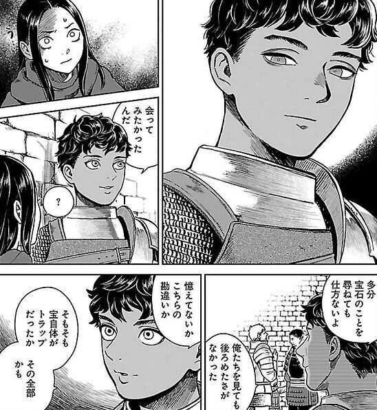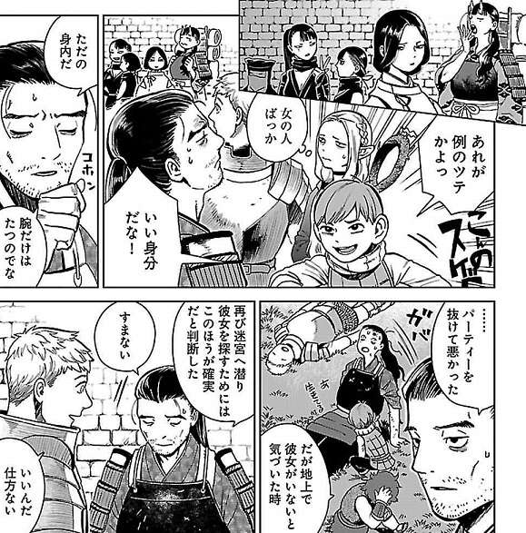迷路から抜け出てやっと階段まで辿り着きましたが、ライオス達はシュローの仲間に魔物と間違われて襲われてしまいました。誤解を解いてライオスがシュローと話していると、ライオス達を盗人と思っているカブルー一行が離れたところから、ライオス達を観察しています。