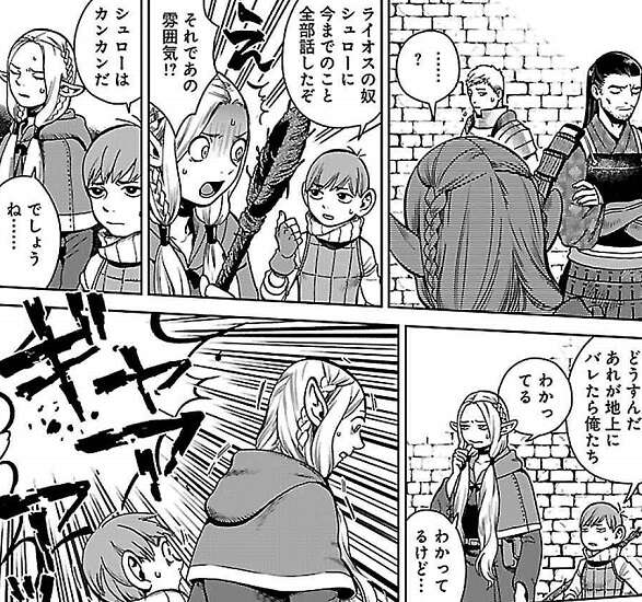 ライオスはファリンを黒魔術で生き返らせた事など、これまでの事をシュローに全部話してしまい、シュローを激怒させてしまいます。さらに調理をしていたシュローの仲間の所に、ハーピーの群れが襲いかかってきてシュローの仲間が応戦します。ハーピーの群れはシュローの仲間に任せて、チルチャックとマルシルはライオスがバラしてしまった黒魔術をどう誤魔化すか話し合います。