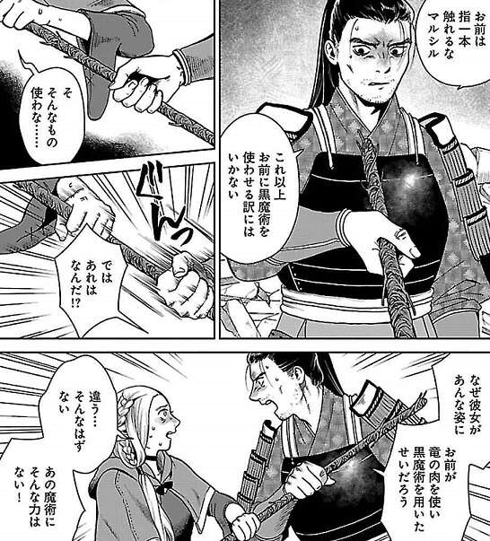 カブルーの攻撃はそれなりのダメージだったのか、ファリンは攻撃した後、その場を離れて逃げていってしまいます。カブルーの仲間、ノームのホルムが死んだ人を蘇生し、マイヅルも蘇生を手伝いますが、マルシルも蘇生を手伝おうとしますがシュローは魔法を使わせず、マルシルを西方エルフに引き渡そうとします。