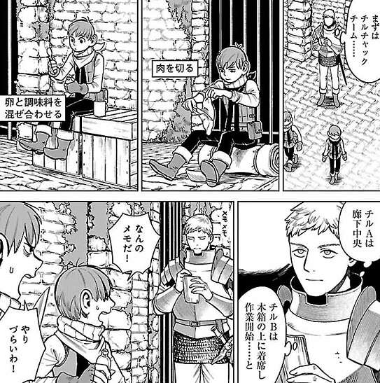 シュローはライオスのパーティーを抜けた後、自分の身内と一緒に迷宮に潜ってシュロー独自にファリンを探していました。シュローはファリンを探すために、ほとんど食事や睡眠をとらずに探索をしていたため、大分やつれています。ライオスは、食事は暇な時にするものじゃない、とシュローを諫めて何か食べようと食事を食べるよう忠告します。