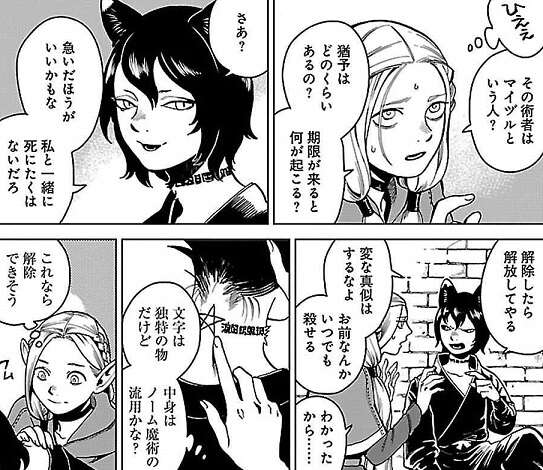 ライオスの見事の犬真似でシェイプシフターを無事、倒しましたが、安心して食事をしていると、シュローの元仲間アセビ、本名イヅツミがセンシを拘束して自分にかかっている呪術を解くように脅迫してきます。イヅツミは性格に問題があったのか、マイヅルに首輪の術をかけられていて、一定時間術者が触れないと呪術が作動するようになっていました。