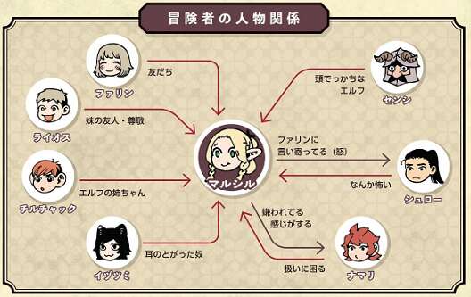 人間関係は、ライオス一行の中では料理をする人として定着しています。鉱夫団の中では、皆と年が離れているので子供扱いされることも多いです。