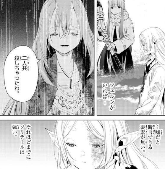 フリーレンは、フェルンがいれば…、と考えますが、ソリテールが二人共殺しちゃったわ、と言っていたことが嘘だと断定できる要素がなく、フェルンが生きているか悩みます。しかし、勇者ヒンメルならきっと最後まで仲間を信じて背中を預けた、とフリーレンは考え、フェルンが生きている方に賭ける事にします。