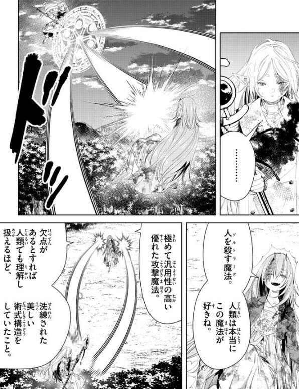 フリーレンは人を殺す魔法(ゾルトラーク)で攻撃をしますが、ソリテールは人を殺す魔法(ゾルトラーク)の解説をしながら攻撃を避けるぐらい、余裕があります。人を殺す魔法(ゾルトラーク)は極めて汎用性の高い優れた攻撃魔法で、猪案では人類の魔法の狩猟になり、南側諸国の戦争では最も人を殺した魔法になった、とソリテールは人を殺す魔法(ゾルトラーク)がどんな魔法であるかを、フリーレンに話します。