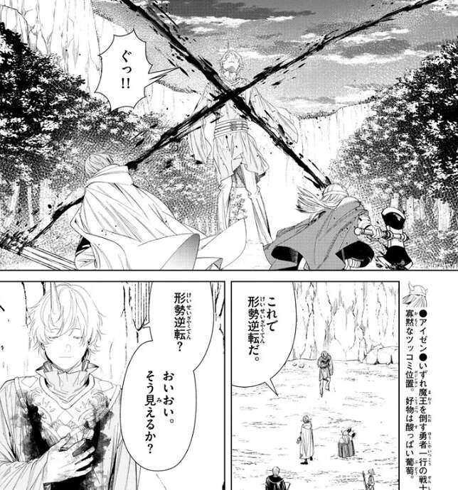 嘘と分かっているのに魔族の言う通りにするヒンメル達に戸惑うツォルトですが、そこにフリーレンが魔法を撃ってきます。ヒンメル達に武器を捨てないように、フリーレンはアイコンタクトを送り、ヒンメルもフリーレンの考えに気付いて、武器を取り戦いを再開します。