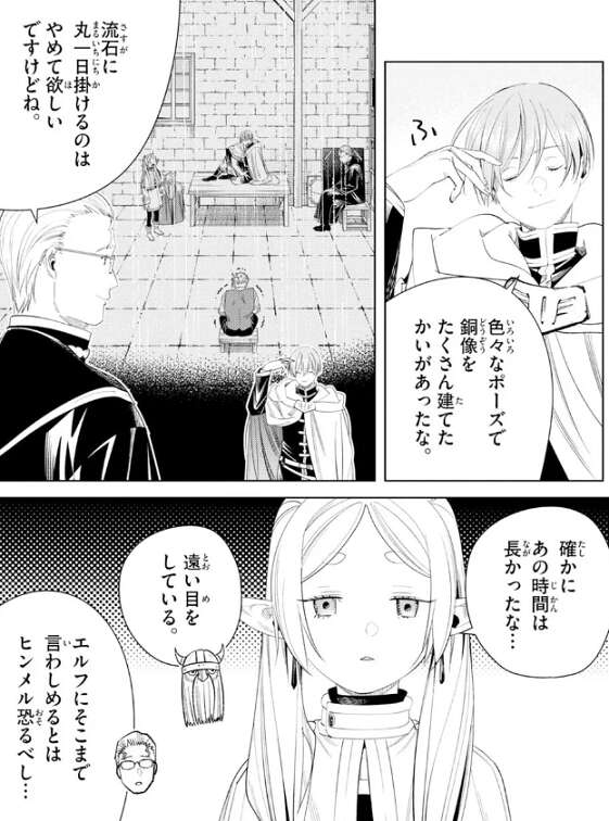 ヒンメルは何故か色々なポーズで銅像をたくさん建てた事を思い出しますが、丸一日掛けるのはやめて欲しい、とハイターに言われてしまいます。フリーレンも、確かにあの時間は長かったな…、と遠い目をします。