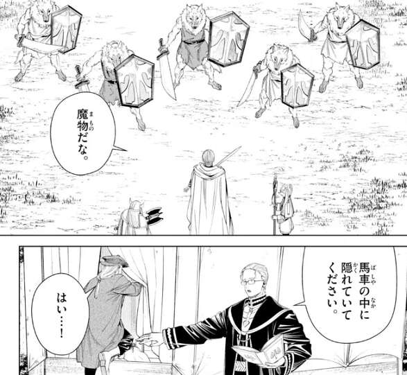 前回、ヒンメルが困っている商人の護衛の仕事を勝手に引き受けてしまい、ヒンメル一行は護衛をしながら北部高原を歩いています。ヒンメルはフリーレンに、未来への帰還方法を探す件が一旦中断した事を謝りますが、別にいいよ、急いでいるわけではなかったから、とフリーレンは答えます。しかし、私なら放っておくけどね、とフリーレンはちくりと毒舌も混ぜます。