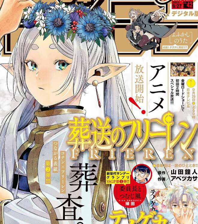 第42号のサンデー表紙はフリーレンです。つながる表紙という事で、第41号のサンデー表紙とつなげるとコナンと一緒に描かれているフリーレンが見れます。