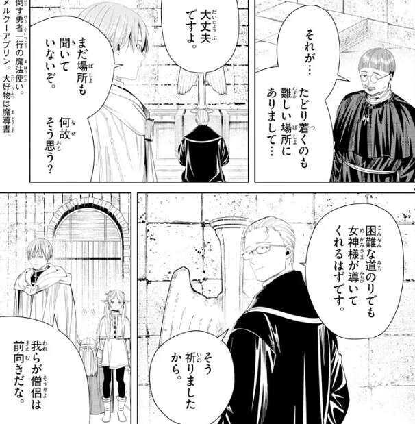 どちらにしろヒンメルに付いて行くつもりです、とハイターは言い、私は自分を信じることはできませんが、勇者ヒンメルのことは信じています、とハイターは断言します。その後、修道院には何とかたどり着きますが、写本を見ても女神の石碑を解読する手掛かりは何も見つかりませんでした。さすがに疲れ果ててしまっていますが、ヒンメルはすぐに、よし次だ!と、前向きです。フリーレンはヒンメルに、流石に前向き過ぎない?と、ツッコみ、ハイターは愉快そうに笑います。