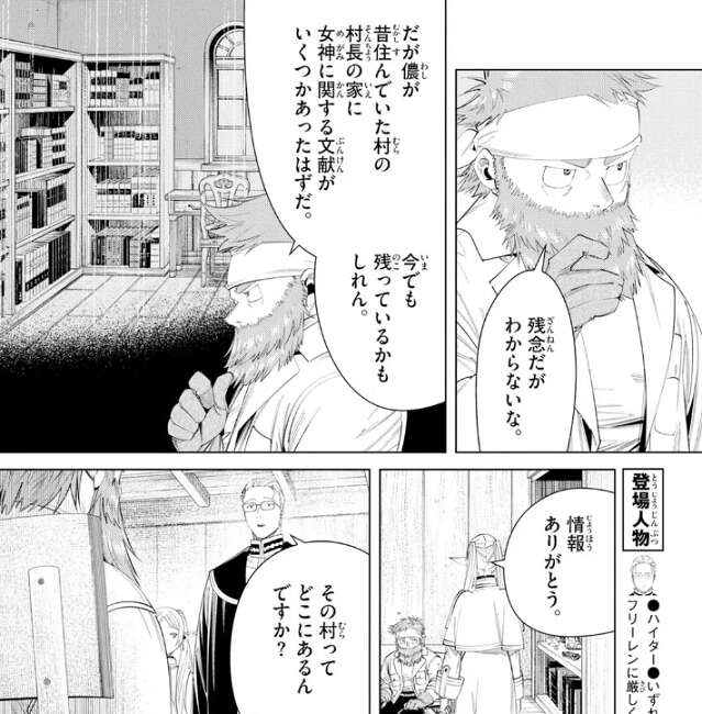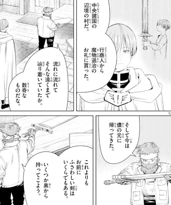 改めてフリーレンがキーゼルに女神の石碑について知りたい、と言うと、キーゼル自身は知りませんが、キーゼルが昔住んでいた村の村長の家に、女神に関する文献がいくつか残っていたはずだという事をキーゼルに教えてもらいます。その村がどこにあるか、キーゼルに聞くと、教えるのは別にいいが、ヒンメルの剣を見せてくれないか?と、キーゼルにヒンメルに言います。勇者の剣を一目拝みたい、というキーゼルに、ヒンメルは構わないと言い自分の剣をキーゼルに渡します。
