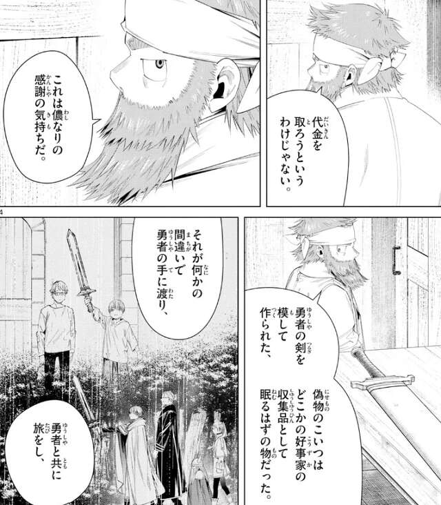 ヒンメルは、待ってくれ、とキーゼルを止めますが、これは儂なりの感謝の気持ちだとキーゼルは答えます。勇者の剣を模して作られた、偽物のこの剣はどこかの好事家の収集品として眠るはずのものでした。しかし、勇者ヒンメルの手に渡り、勇者と共に旅をしている事に、キーゼルは驚きます。